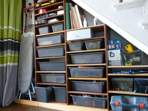 Hay đơn giản tận dụng thành các kệ chứa nhiều khay đặt để các thứ như búa, kiềm, đinh ốc...nếu như nhà bạn chứa quá nhiều những linh kiện, vật dụng kiểu như thế này.
