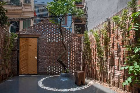 Nằm trên một con hẻm nhỏ ở đường Hào Nam, Đống Đa (Hà Nội), ngôi nhà này nổi bật hơn hẳn những ngôi nhà xung quanh bởi cánh cổng bằng gỗ và gạch mộc rất độc đáo.