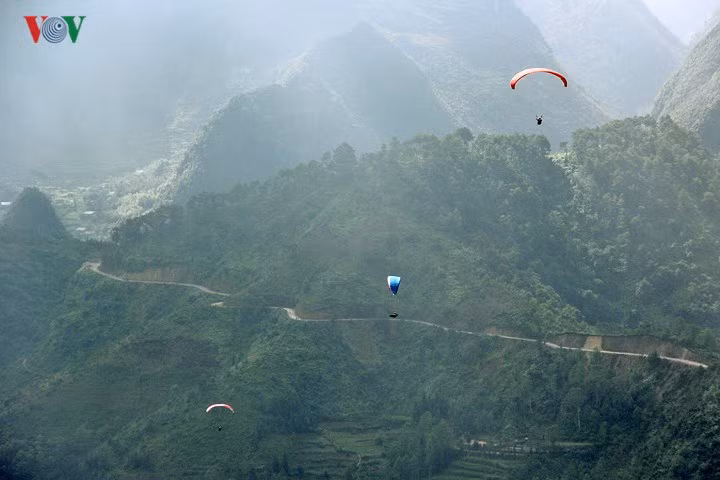 Đỉnh đèo Khau Phạ có mưa phùn, sương mù nhưng nhiều cánh dù của các VĐV nhiều kinh nghiệm vẫn có thể đưa du khách lên độ cao hàng trăm mét để bay lượn ngắm cảnh.