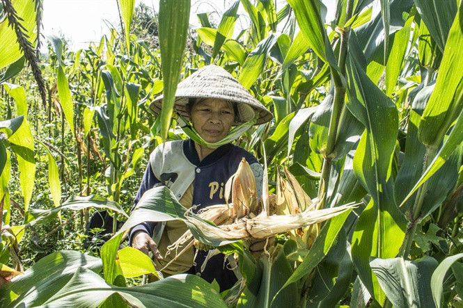 Bà Huần xót vì khỉ ăn ngô, nhưng vẫn không nhịn được cười vì nó quá nghịch ngợm (Ảnh: Văn Chương)