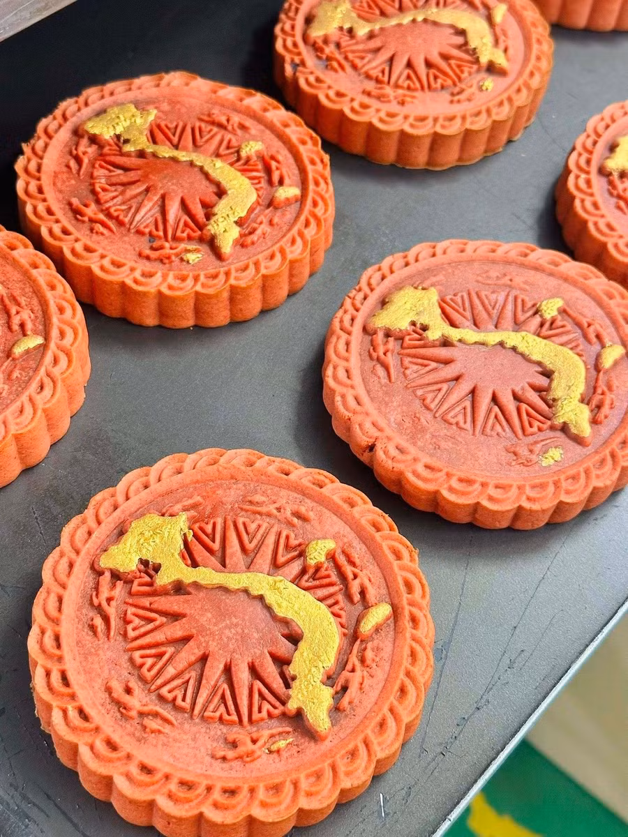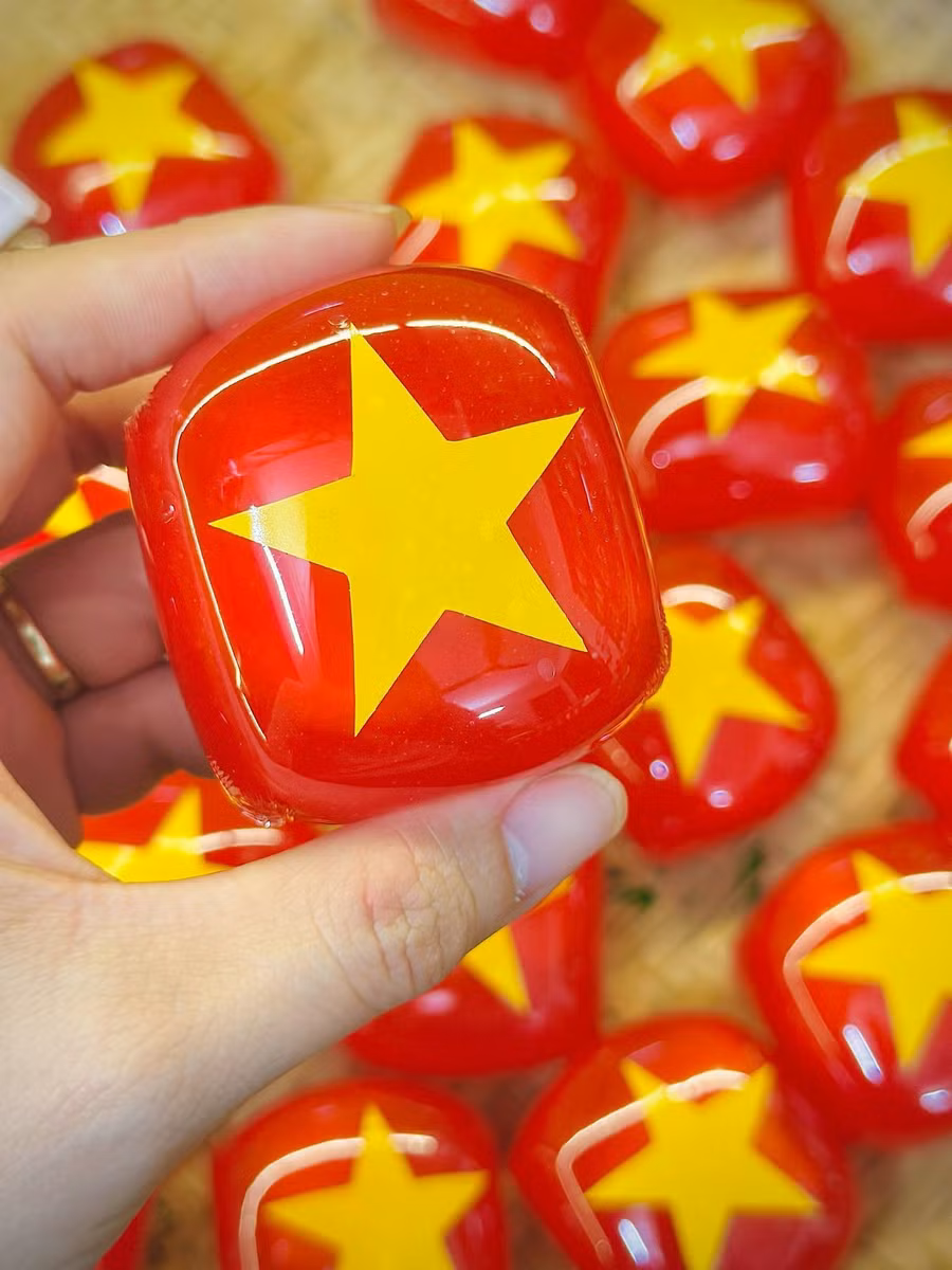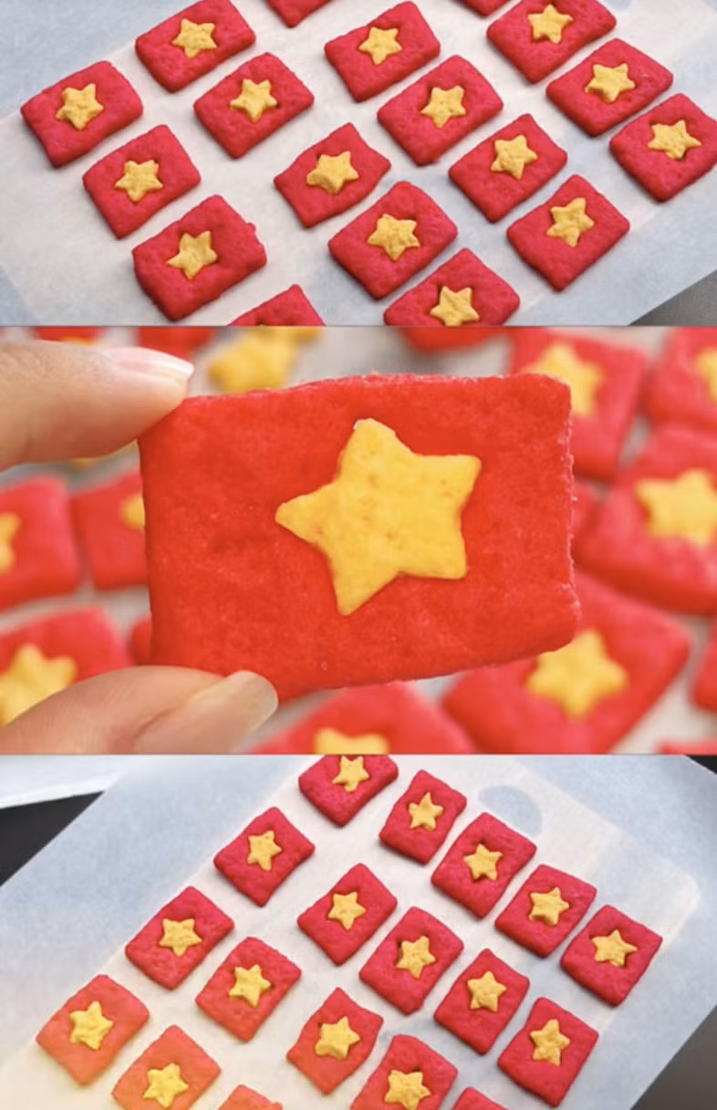 Để bày tỏ lòng tự hào về đất nước mình, chị Đỗ Thu Ngọc (35 tuổi, giáo viên tại Hà Nội) mang đến vẻ đẹp mới cho món bánh xu xê truyền thống bằng cách tạo nền đỏ rực rỡ của quốc kỳ cho chúng, điểm thêm ngôi sao vàng chói lọi.