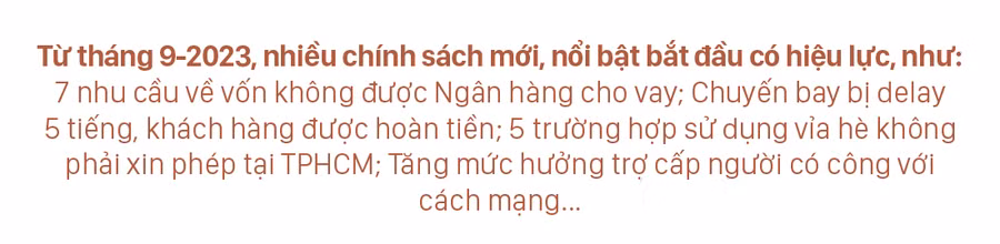 Từ tháng 9-2023, nhiều chính sách mới, nổi bật bắt đầu có hiệu lực, như: 7 nhu cầu về vốn không được ngân hàng cho vay; Chuyến bay bị delay 5 tiếng, khách hàng được hoàn tiền; 5 trường hợp sử dụng vỉa hè không phải xin phép tại TPHCM; Tăng mức hưởng trợ cấp người có công với cách mạng...