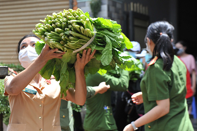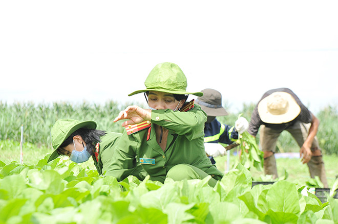 | Giữa nắng trưa, hàng chục cán bộ, chiến sĩ vẫn miệt mài hái rau để kịp gửi vào ủng hộ bà con vùng dịch. |