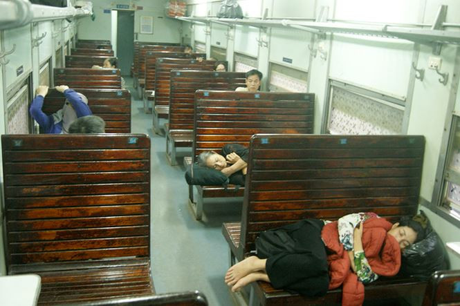 Mỗi người nằm 1 ghế, hầu hết các ghế vẫn trống, dù chỉ có một toa ghế cứng.  Ảnh chụp tàu Quán Triều- Long Biên