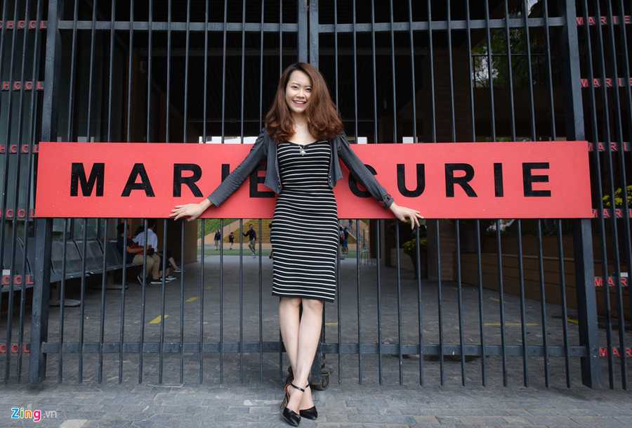 Trường Marie Curie có cơ sở vật chất hiện đại ở thủ đô. Bất cứ ngóc ngách nào trong ngôi trường được trao giải kiến trúc quốc gia này cũng là nơi chụp ảnh thú vị của cô trò. Diễm Hiền chụp ảnh cùng tượng nữ nhà bác học Marie Curie thuộc khuôn viên trường.