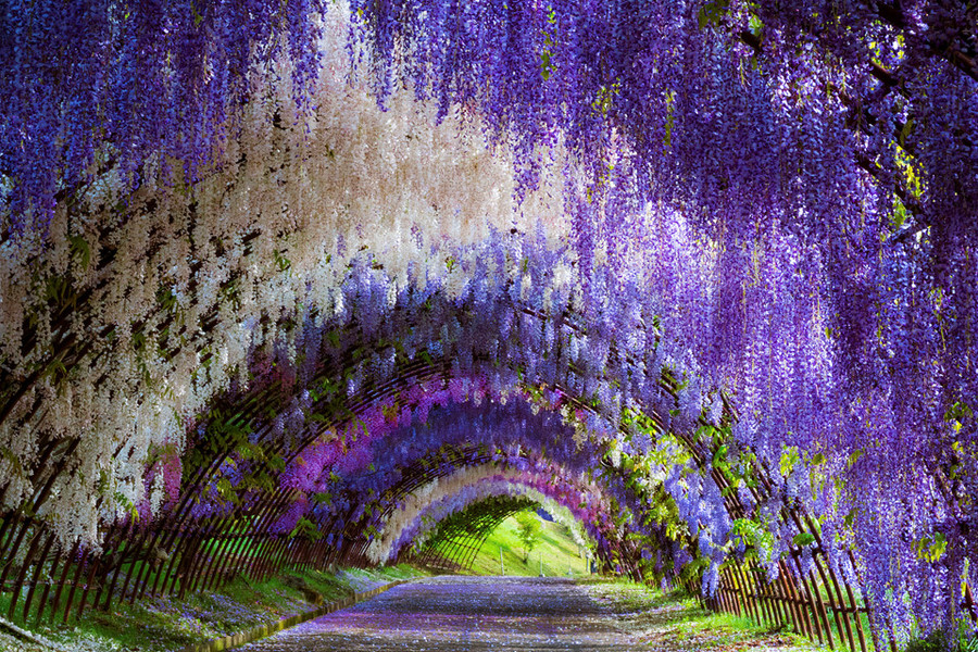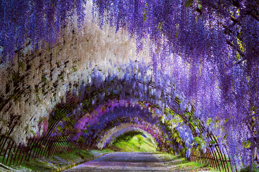 Vườn Kawachi Fuji (Fukuoka): Hoa tử đằng, loài hoa trứ danh xứ mặt trời mọc, đại diện cho tình yêu vĩnh cửu được trồng thành đường hầm tại vườn Kawachi Fuji tọa tại thành phố Fukuoka. Khu vườn hiện có khoảng 150 cây tử đằng với hơn 20 chủng khác nhau. Điểm thu hút du khách nhất tại khu vườn này là đường hầm tử đằng rợp sắc tím, trắng, đẹp tựa xứ thần tiên. Lễ hội hoa tử đằng thu hút khách du lịch thường được tổ chức từ tháng 4-5 hàng năm, đây là thời điểm tử đằng nở rực rỡ nhất. Ảnh: Carlsson.