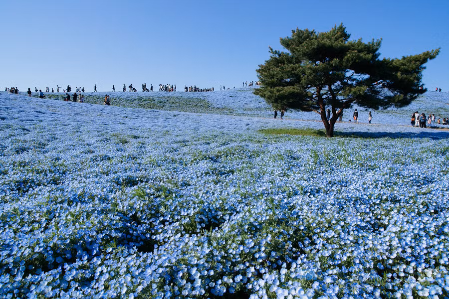 Công viên Hitachi (Ibaraki): Từ tháng 4-5 hàng năm, công viên Hitachi được phủ xanh bởi sắc màu nở rộ của hơn 4 triệu bông hoa nemophilas. Công viên nằm trên đồi Miharashi, hoa nemophilas là một trong những loài hoa tạo điểm nhấn, thu hút du khách đến thăm địa danh này. Các loài hoa ở Hitachi được trồng theo mùa. Vào mùa thu, nơi đây nổi tiếng với loài cây bụi kochia như những cục bông khổng lồ, đầu thu có màu xanh vàng, cuối thu, đầu đông cây chuyển sắc đỏ, dập dìu trong gió. Ảnh: Toshiaki.
