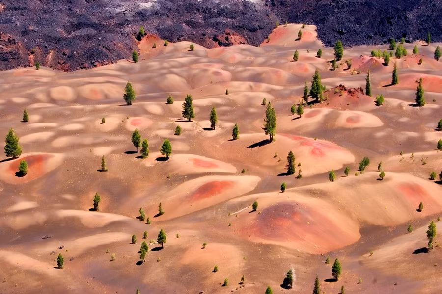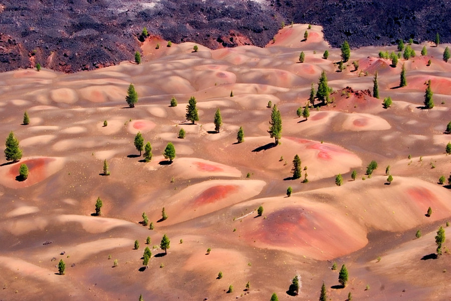 Cảnh tượng giống như một thiết kế đồ họa này có tên là Painted Dunes, nằm trong Vườn Quốc gia Lassen ở California, Mỹ. Màu sắc lạ lùng của đất đá nơi đây được hình thành từ quá trình oxy hóa của tro núi lửa.