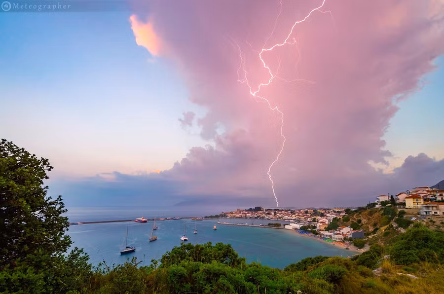 Một tia sét lạc lõng trong ánh bình minh ở Pythagoreio, đảo Samos, Hy Lạp.