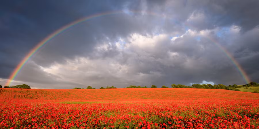 Cầu vồng xuất hiện sau một cơn mưa rào trên cánh đồng hoa ở Salisbury, Wiltshire, Anh.