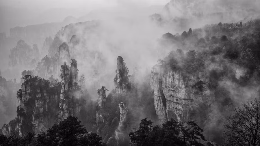 Những ngọn núi đá của công viên quốc gia Trương Gia Giới (Trung Quốc) càng trở nên kỳ ảo trong sương khói.