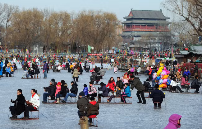 Vào mùa đông, hàng trăm người tới thắng cảnh Shichahai ở trung tâm thành phố Bắc Kinh, Trung Quốc, để trượt băng và ngồi xe kéo trên mặt hồ đóng băng.
