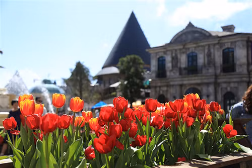 Chào mùa xuân đến, những loài hoa trên vùng núi Chúa cũng đua nhau khoe sắc. Đào chuông thắm hồng bung nở từng chùm giữa bồng bềnh mây bay, hoa tulip rạng rỡ khiến du khách ngỡ mình lạc bước trên một góc nhỏ Hà Lan, những chồi non cựa mình xanh non mơn mởn ôm lấy những con đường đá cổ kính…