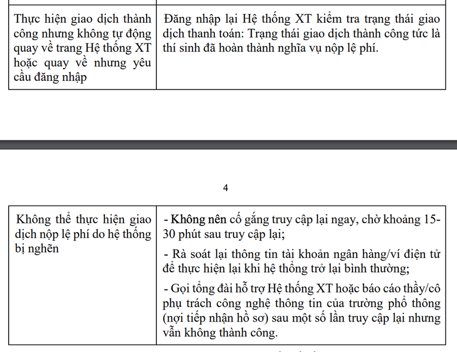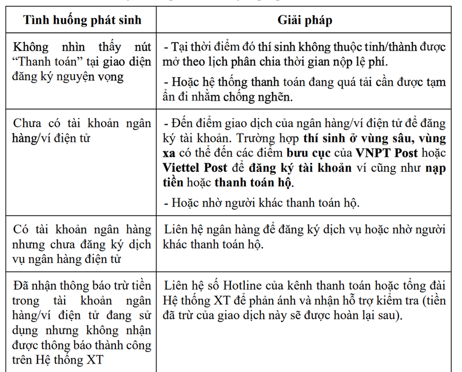 Khi phát sinh tình huống trong lúc thanh toán trực tuyến trên một kênh thanh toán cụ thể, thí sinh có thể liên hệ số điện thoại đường dây nóng hiển thị trên trang thanh toán của kênh đó hoặc liên hệ Tổng đài hỗ trợ Cổng Dịch vụ công Quốc gia theo số 18001096.