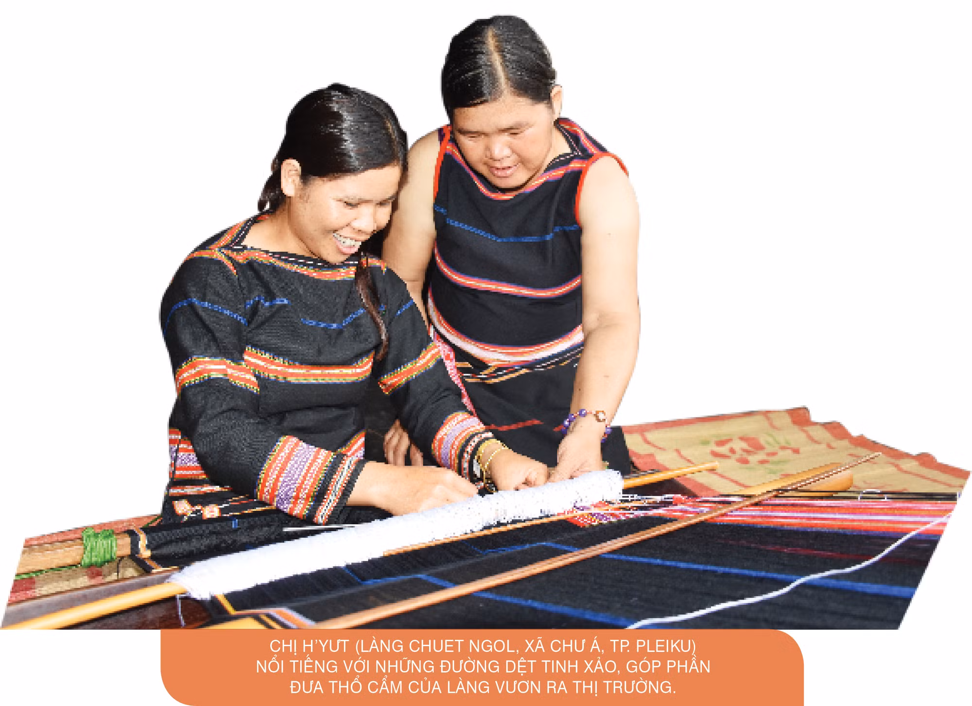 Bên khung dệt sẫm màu thời gian, chị H'Yưt (làng Chuét Ngol, xã Chư Á, TP. Pleiku) tỉ mẩn kiểm tra những đường nét hoa văn trên tấm vải. Hơn 40 tuổi, chị được xem là nghệ nhân có đôi bàn tay khéo léo nhất làng. Với chị, dệt thổ cẩm truyền thống không chỉ là nghề mà còn là niềm đam mê. Chị luôn mong nghề dệt thổ cẩm được bảo tồn và phát triển ngay trên quê hương mình. Bởi vậy, chị không ngừng sáng tạo để dệt nên những tấm thổ cẩm đẹp nhất.