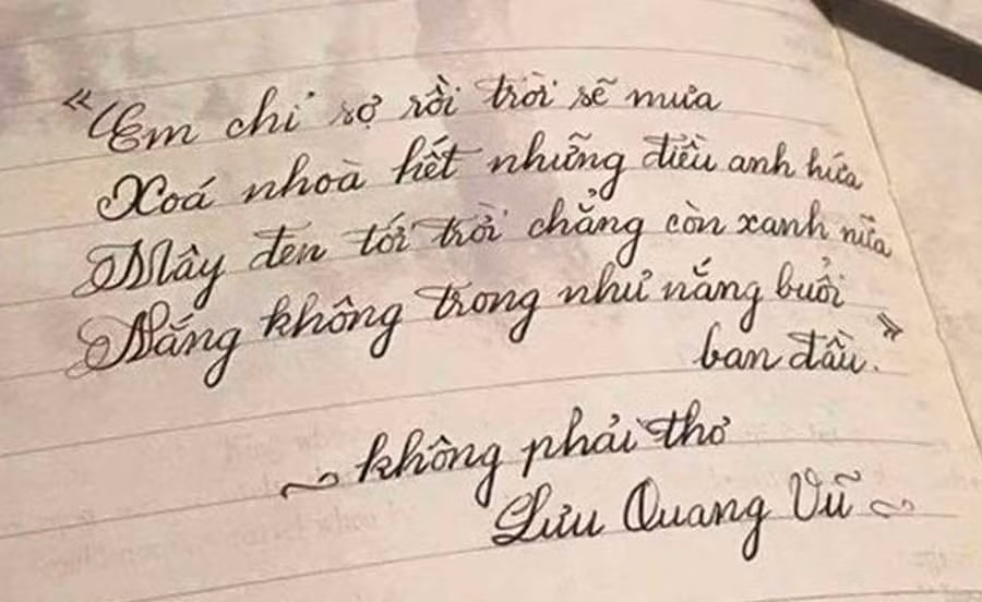 Tôi đã hình dung ra dáng ngồi gầy guộc của mẹ, tóc hoa râm lơ phơ, kê tờ lịch trên tờ báo, mắt đeo kính và viết nắn nót thẳng hàng. Những câu thơ quen thuộc ấy tôi đã gặp vài lần trong những bức thư pháp viết kiểu cách, nhưng chỉ khi nhìn những nét chữ chân phương của mẹ tôi mới trào nước mắt.