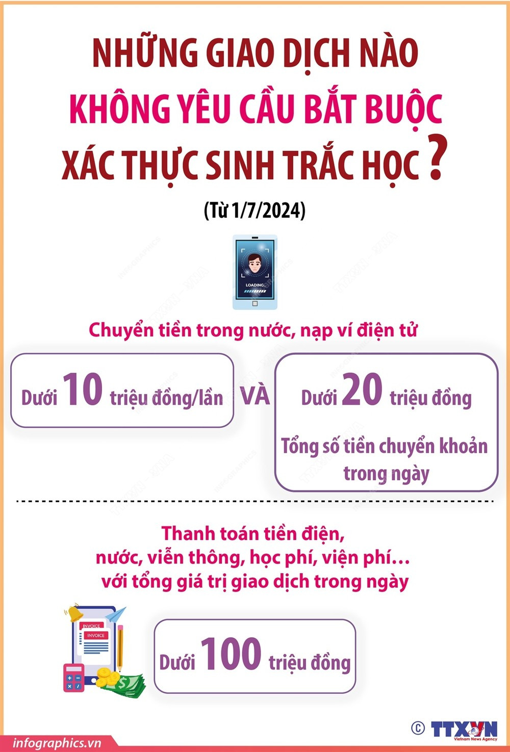 Theo Quyết định 2345/QĐ-NHNN ngày 18/12/2023 của Thống đốc Ngân hàng Nhà nước, từ 1/7/2024, chuyển khoản trực tuyến trên 10 triệu đồng/giao dịch hoặc giá trị từ 10 triệu đồng trở xuống nhưng tổng giá trị giao dịch trong ngày đạt trên 20 triệu đồng thì phải xác thực xác thực sinh trắc học.