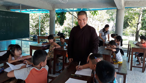 Thầy Thích Đạo Tri, trụ trì chùa Lập Thạch là người tâm huyết với việc mở lớp dạy học miễn phí để củng cố kiến thức cho học sinh vững bước sang năm học mới.