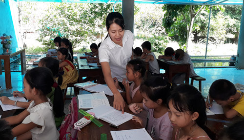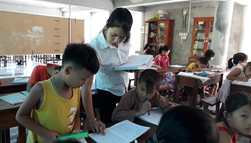 Vượt quãng đường 30km từ nhà ở xã Triệu Trung (Triệu Phong), cô giáo Thiều Thị Ngân Hà (SN 1989, hiện là giáo viên Trường Tiểu học và THCS Húc Nghì, Đakrông) mang theo hai con nhỏ 3 và 5 tuổi đến chùa để tham gia dạy miễn phí. “Cứ mùa hè là có nhiều trung tâm dạy thêm mời nhưng mình vẫn quyết định đi dạy miễn phí. 6 giờ sáng mình xuất phát từ nhà đến chùa, dạy xong thì ở lại buổi trưa, đến chiều mát lại chở con về. Thấy mình làm việc ý nghĩa, dù biết vất vả nhưng chồng rất ủng hộ” – cô Hà tâm sự.