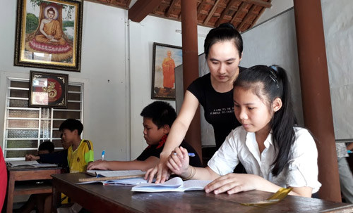 Giáo viên dạy miễn phí ở chùa Lập Thạch với bầu nhiệt huyết, tận tâm và hết mực yêu thương học sinh. Ảnh: Ngọc Vũ