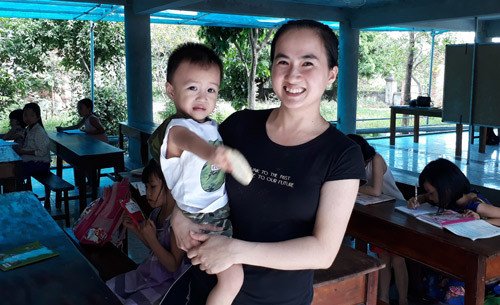 Không có người trong coi, cô giáo Hoàng Thị Hồng Gấm đem theo con nhỏ đến chùa Lập Thạch và dạy học cho học sinh.