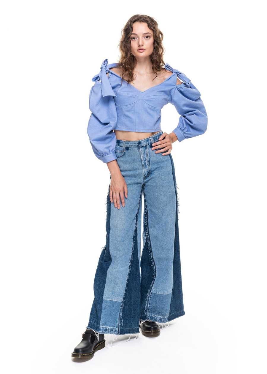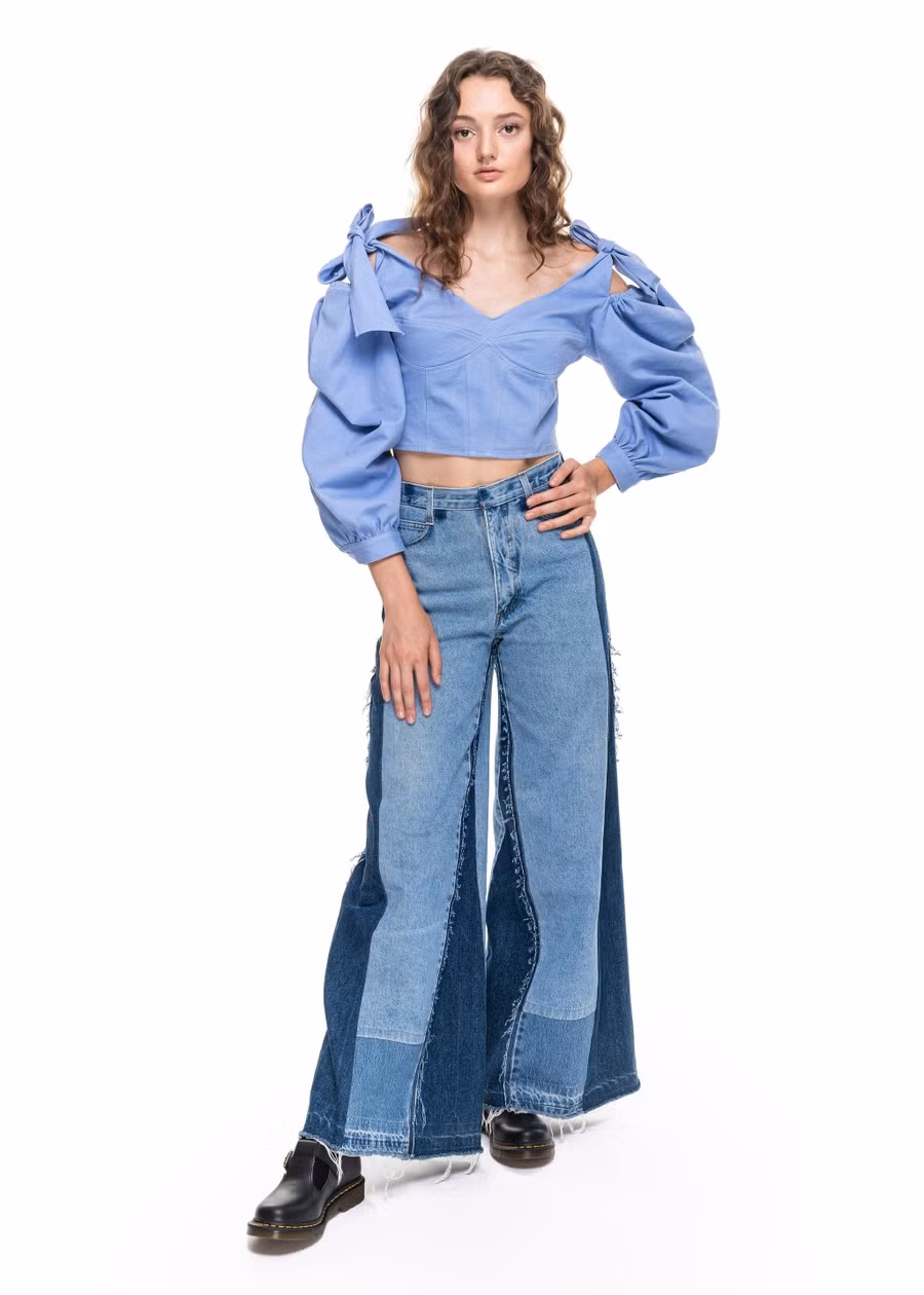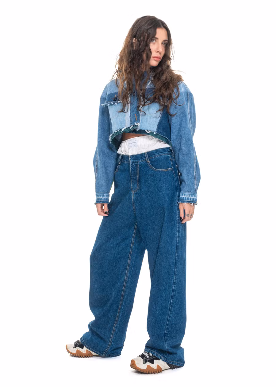 | Xu hướng chắp vá ngày càng được ưa chuộng, đặc biệt với chất liệu denim. Kiểu quần jeans lửng lưng cao này được tái chế từ chiếc quần shorts Bermudas, phối màu chắp vá theo đường chéo. |