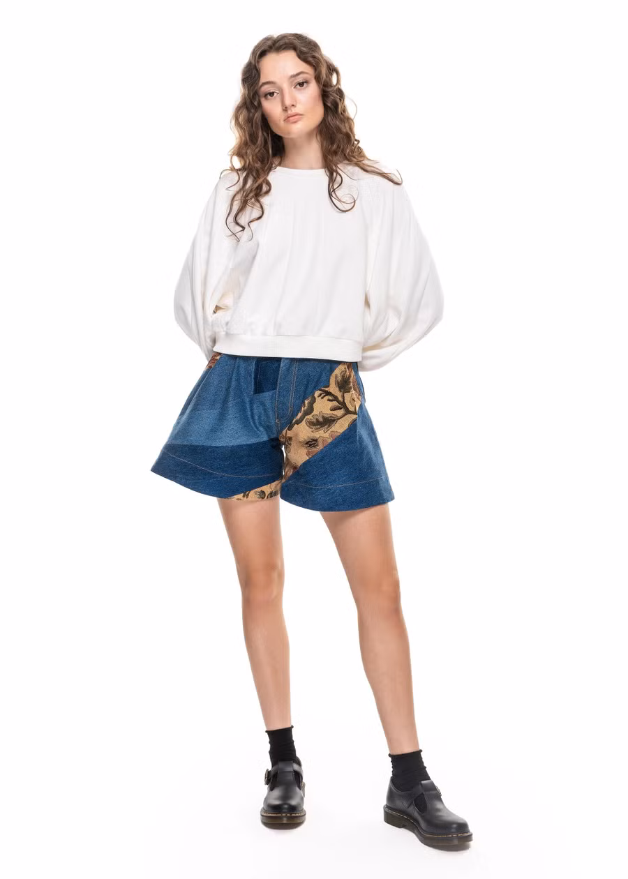 Chiếc quần shorts bằng denim của Ksenia Schnaider được làm mới bằng cách ghép các mảnh vải khác màu và nhấn bằng chi tiết jacquard. Mùa thời trang Thu Đông các xu hướng vẫn tiếp tục lấy cảm hứng từ phong cách retro và xu hướng denim nổi bật nhất chính là kiểu quần jeans có đặc điểm trung gian hoàn hảo giữa sự thoải mái và phong cách.