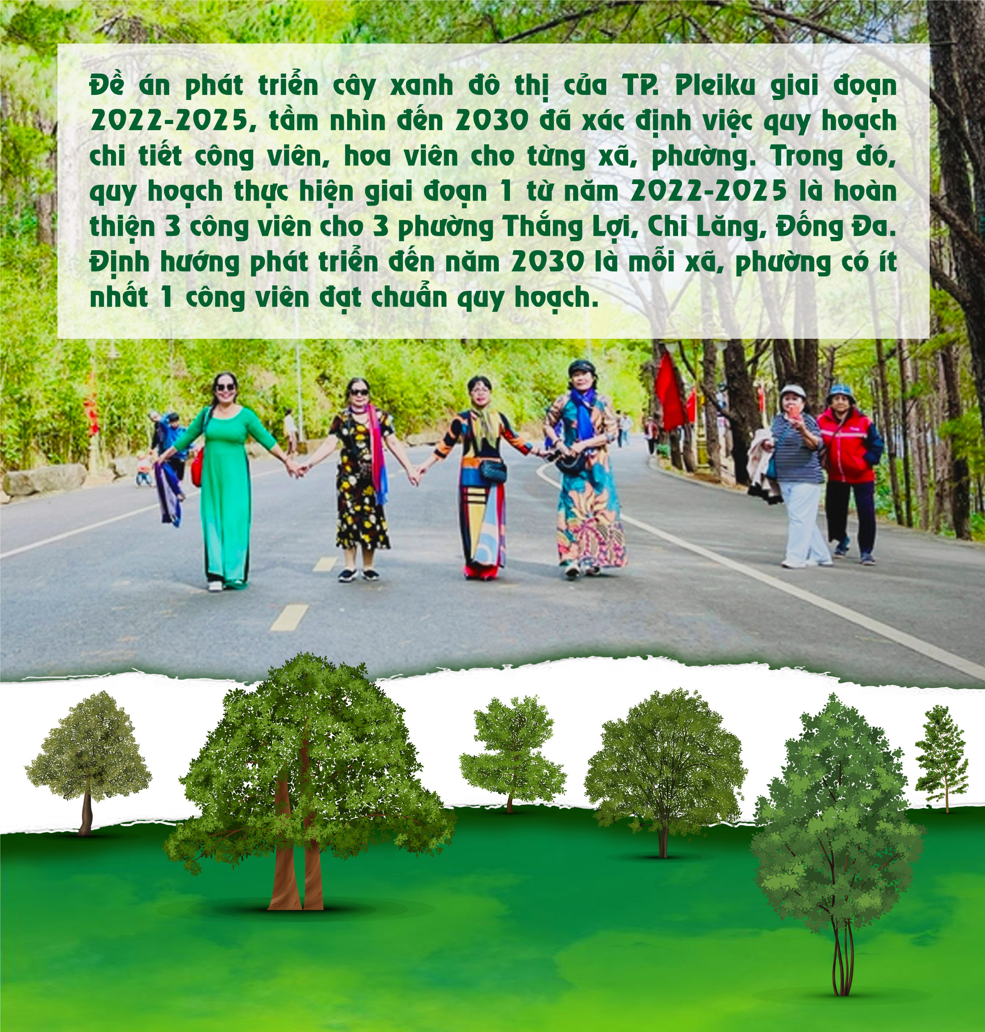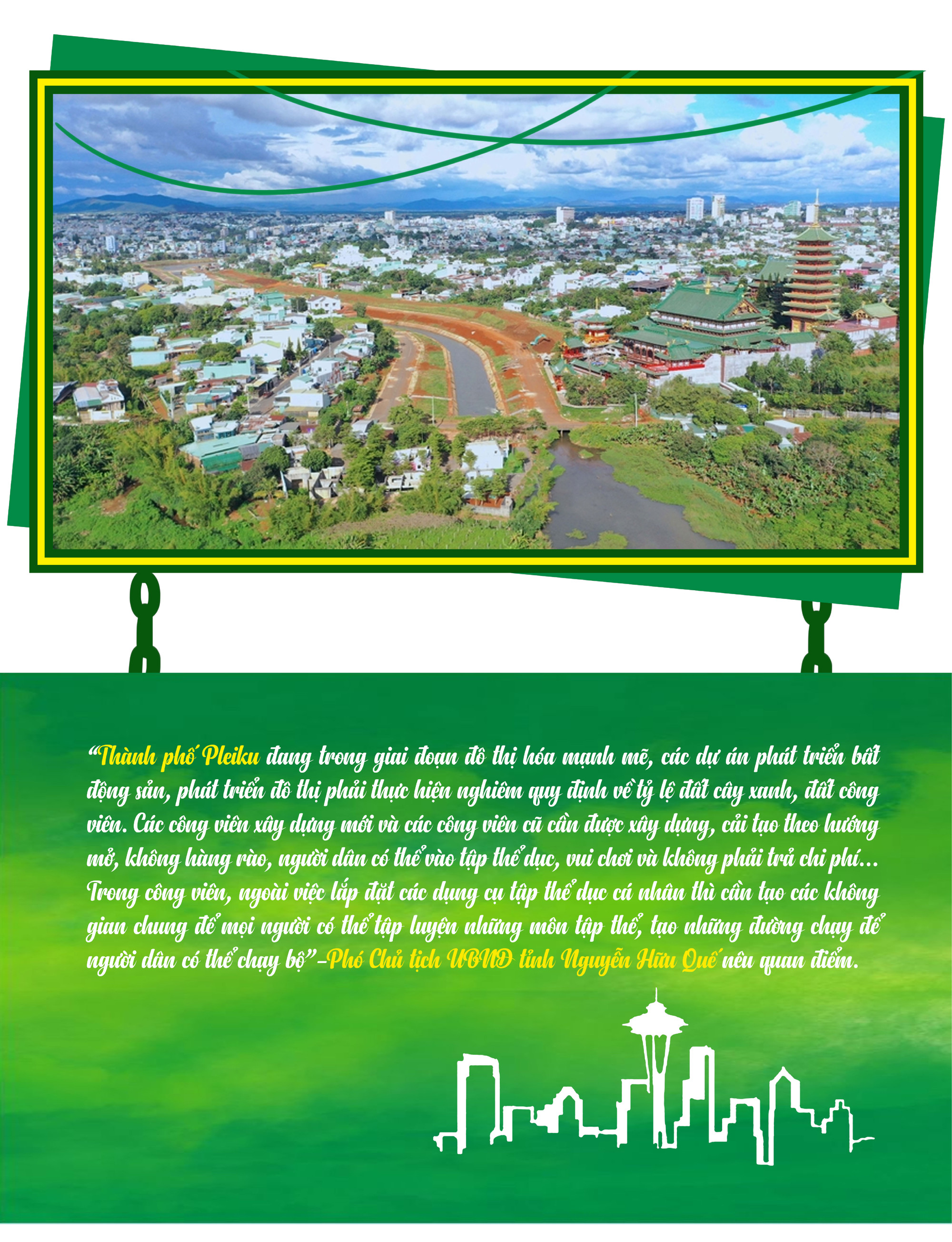 Theo Đề án phát triển cây xanh đô thị Pleiku giai đoạn 2022-2025, tầm nhìn đến 2030, đối với đô thị loại I, loại II có quy mô dân số từ 250.000 đến dưới 1,5 triệu người thì diện tích đất cây xanh công viên phải đạt 6-7,5 m2/người. Thế nhưng, con số này lại cách khá xa so với thực tế của TP. Pleiku hiện nay. Vì vậy, để có thể đạt được tiêu chuẩn nói trên, bên cạnh việc duy tu, tôn tạo, chăm sóc tốt các công viên, hoa viên hiện có, công tác quy hoạch phải được đặt lên hàng đầu.