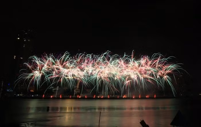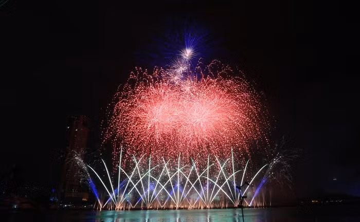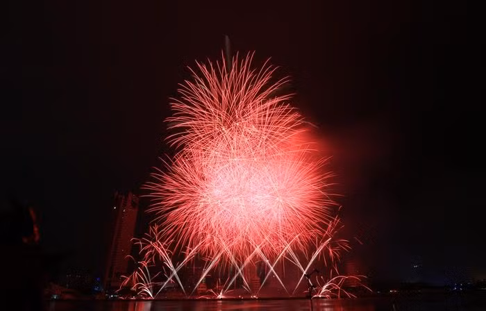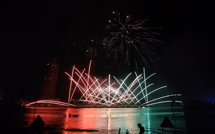 Sau lễ khai mạc, 2 đội Việt Nam và Áo cùng trình diễn những màn bắn pháo hoa hoành tráng và rực rỡ trên sông Hàn.