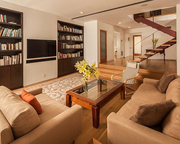 Phòng khách hiện đại với kiến trúc sinh động, ấm áp.