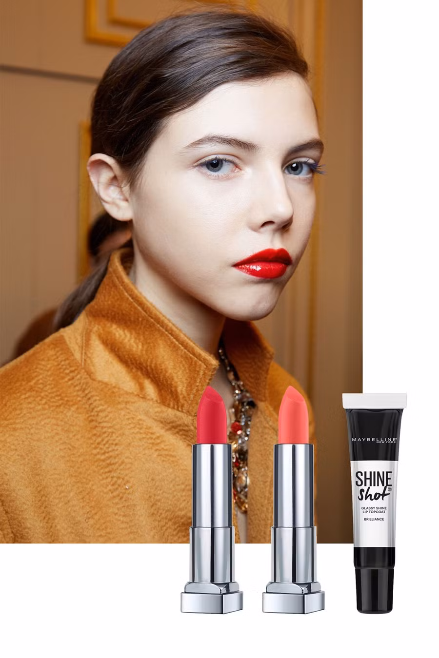 Cam neon: Trong show thời trang của Jason Wu, chuyên gia trang điểm gợi ý màu son đỏ cam, nhưng không phải đỏ cam thông thường mà là màu neon. Để đôi môi quyến rũ hơn, chuyên gia phủ thêm một lớp son bóng.