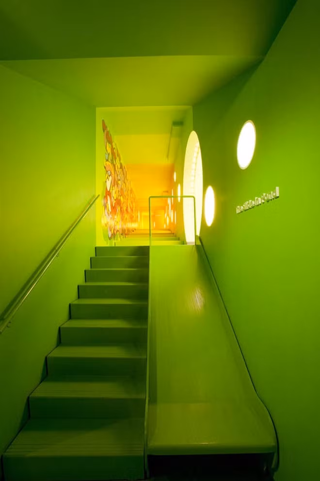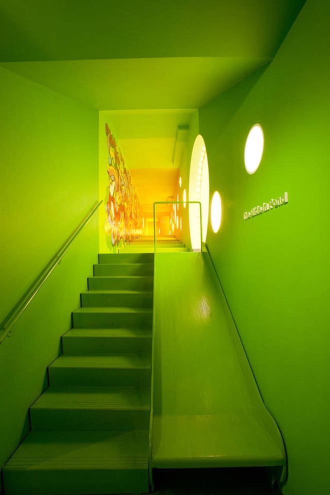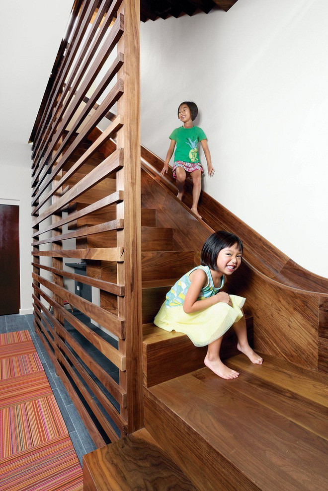 Từ trước đến nay cầu thang vẫn luôn được coi là không gian vui chơi thay thế ở những ngôi nhà có diện tích nhỏ, nơi mà chủ nhân không thể sắp xếp thêm được chút diện tích nào cho việc chơi đùa của con mình.