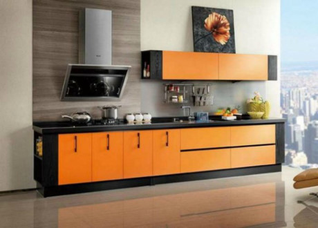 Nếu sợ hãi với những vết dầu mỡ cứng đầu, bạn có thể chọn thiết kế tủ bếp Acrylic, loại vật liệu dễ dàng lau chùi và phổ biến của các loại tủ kệ ở những căn hộ cao cấp. Sắc cam phối hợp với màu đen tạo nên cái nhìn mạnh mẽ, nổi bật.