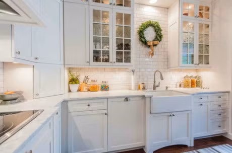 Cũng là loại tủ bếp thủy tinh nhưng kết hợp với tủ gỗ màu trắng sẽ phù hợp với không gian truyền thống.