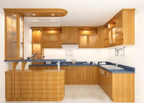 Tủ bếp thiết kế với loại gỗ nặng, cứng, vân đẹp, thớ gỗ mịn, sơn một lớp PU bóng phù hợp với những chủ nhân yêu thích sự cổ điển.