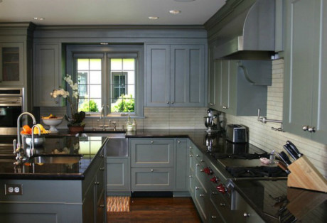 Cũng là gam màu xám nhưng xám đậm ở toàn bộ tủ bếp, lọ hoa trang trí, đèn, chạn bát đem lại sự mạnh mẽ và nổi bật.
