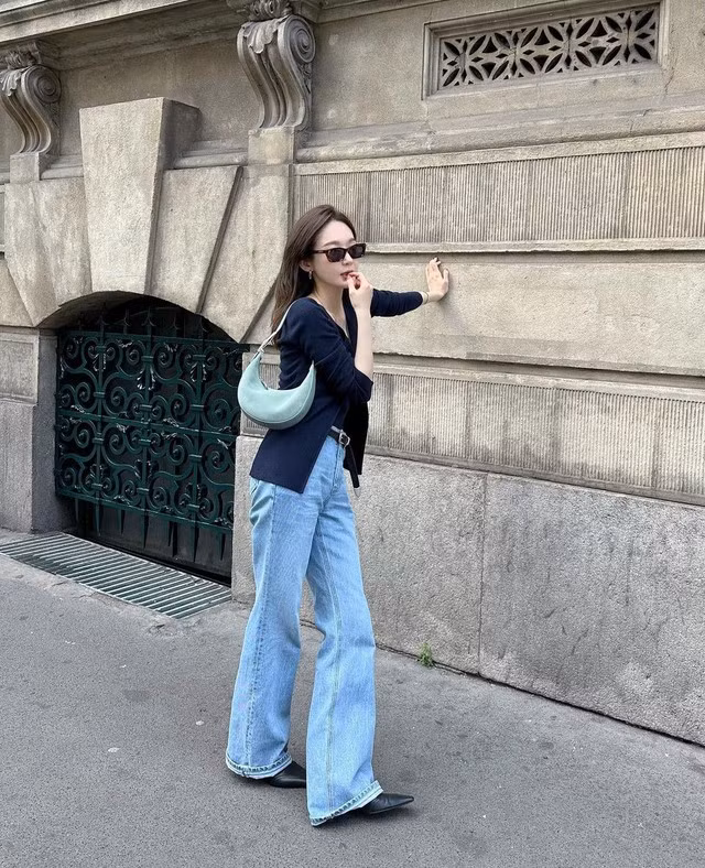 Nếu bạn đang tìm kiếm một chiếc túi hằng ngày dễ mang theo, thì hãy học cô nàng Kang Min Kyung sử dụng túi hobo. Nhờ hình dạng tròn, item này tạo sự thoải mái khi đeo mà vẫn có thể đựng đồ tuyệt vời, màu xanh của túi hobo nhãn hàng Longchamp còn giúp outfit thêm nổi bật, ấn tượng
