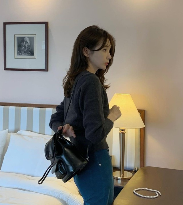 Mẫu balo mini có thể vừa đeo vừa khoác sau lưng được nữ diễn viên Kang Min Kyung ưu ái mix cùng áo dệt kim và quần denim xuống phố mùa thu. Item với thiết kế túi nhỏ trước tạo ấn tượng không nhỏ cho chủ nhân. Balo còn là item khá "dễ tính", có thể kết hợp với nhiều kiểu trang phục từ những mẫu sporty như quần shorts, áo phông cho đến những mẫu váy áo in hoa dài thướt tha, yểu điệu
