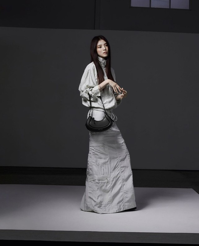 Không chỉ đam mê với những mẫu túi hàng hiệu đắt đỏ mà nữ diễn viên sinh năm 1994 cũng rất thích những mẫu túi hàng bình dân. Cô mix túi xách màu đen với chân váy maxi túi hộp màu ghi và áo khoác gió tiệp màu