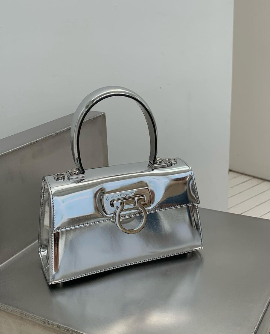 Túi tote hình vuông màu bạc của nhà mốt Salvatore Ferragamo được nữ diễn viên Cha Jung Won mix cùng một concept màu đen để tạo điểm nhấn cho set đồ tối giản. Túi xách với phần da bóng màu bạc mang đến nét tinh tế, thanh lịch cho tổng thể