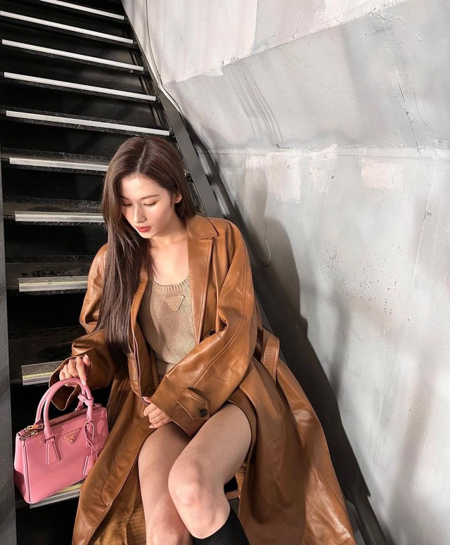 Xuống phố mùa lạnh với áo khoác da màu nâu dáng dài và chân váy ngắn, cô nàng Sana thắp sáng set đồ mùa thu bằng mẫu túi xách màu hồng đầy ngọt ngào của nhà mốt Prada. Cách mix đồ này tạo nên một outfit đầy sáng tạo nổi bật nhưng vẫn thật ưng mắt