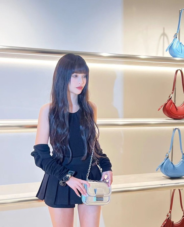 Lần khác, cô xuất hiện vô cùng trẻ trung trong bản phối chân váy ngắn họa tiết mix cùng áo sơ mi, giày loafer, tất lỡ trắng và không quên kết lại outfit bằng mẫu túi xách màu bạc hình bán nguyệt. Thiết kế mẫu túi tuy đơn giản nhưng khi mang theo chúng bạn sẽ khiến người đối diện phải khen nức nở diện mạo đầy thanh lịch và tinh tế của mình