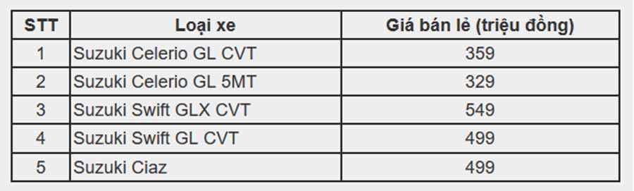 Dòng xe đô thị phân khúc A nhỏ gọn của Suzuki gồm hai phiên bản số tự động vô cấp CVT phù hợp với sử dụng cho gia đình nhỏ, nữ với giá 359 triệu đồng và bản số sàn 5 cấp 5MT phù hợp sử dụng kinh doanh với giá 329 triệu đồng. Trong phân khúc của mình, Celerio sở hữu mức giá cạnh tranh.