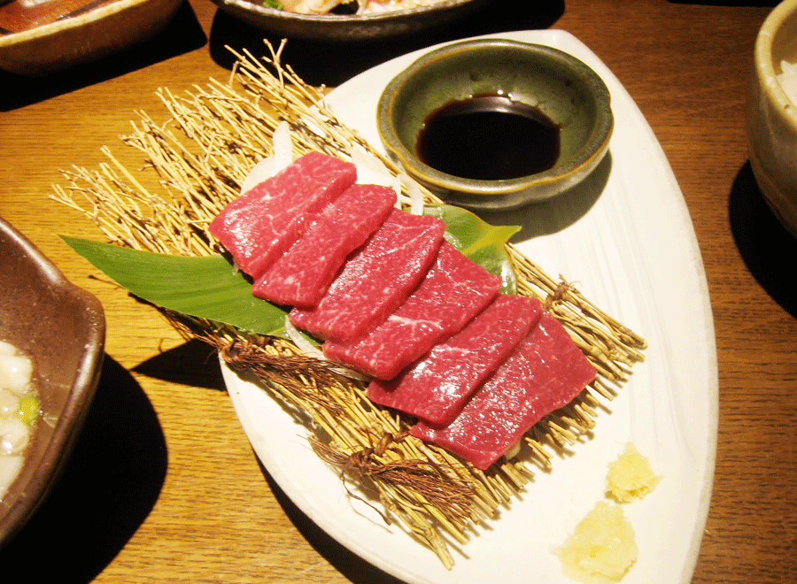 Basashi là món sashimi thịt ngựa, một món ăn truyền thống của Nhật Bản rất được người dân địa phương yêu thích nhưng với du khách nó được đánh giá là món ăn kinh dị. Tuy nhiên Basashi cũng giống như các món gỏi thông thường ở Việt Nam, vì thế rất đáng để bạn thưởng thức khi du lịch Kyushu. Những thớ thịt ngựa ngon nhất được đầu bếp chọn ra và thái thành lát mỏng sau đó vắt thêm chanh khi thưởng thức. Người Nhật thường ăn Basashi cùng với gừng, tương trộn cay và mù tạt.