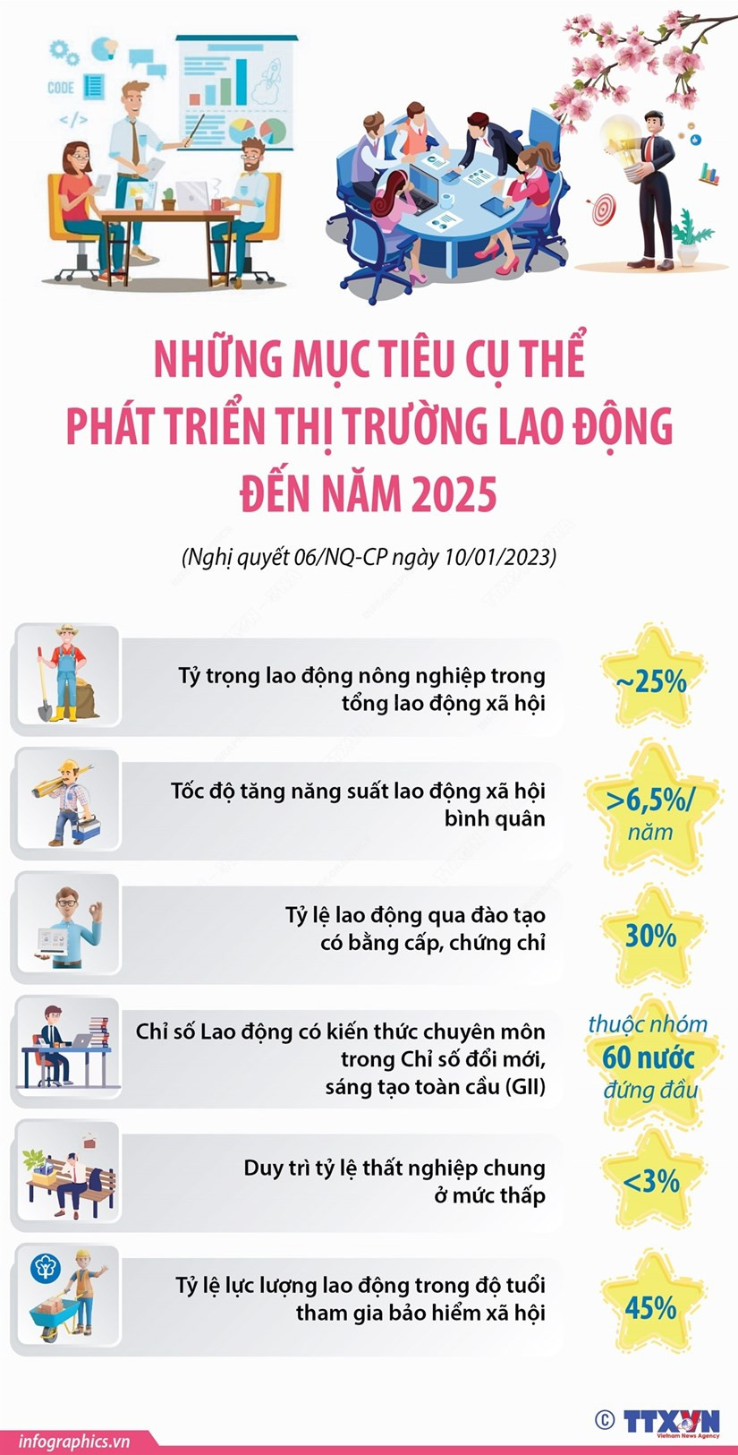 Chính phủ ban hành Nghị quyết 06/NQ-CP ngày 10/01/2023 về phát triển thị trường lao động linh hoạt, hiện đại, hiệu quả, bền vững và hội nhập nhằm phục hồi nhanh kinh tế-xã hội. Theo đó, mục tiêu cụ thể phát triển thị trường lao động phấn đấu đến năm 2025.