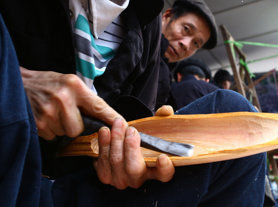 | Công đoạn gọt bầu đàn của Mua Mí Hồng. |