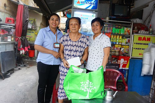 Bà Lê Thị Hải (bìa trái) tặng quà cho một trường hợp có hoàn cảnh khó khăn Ảnh: THU TRANG