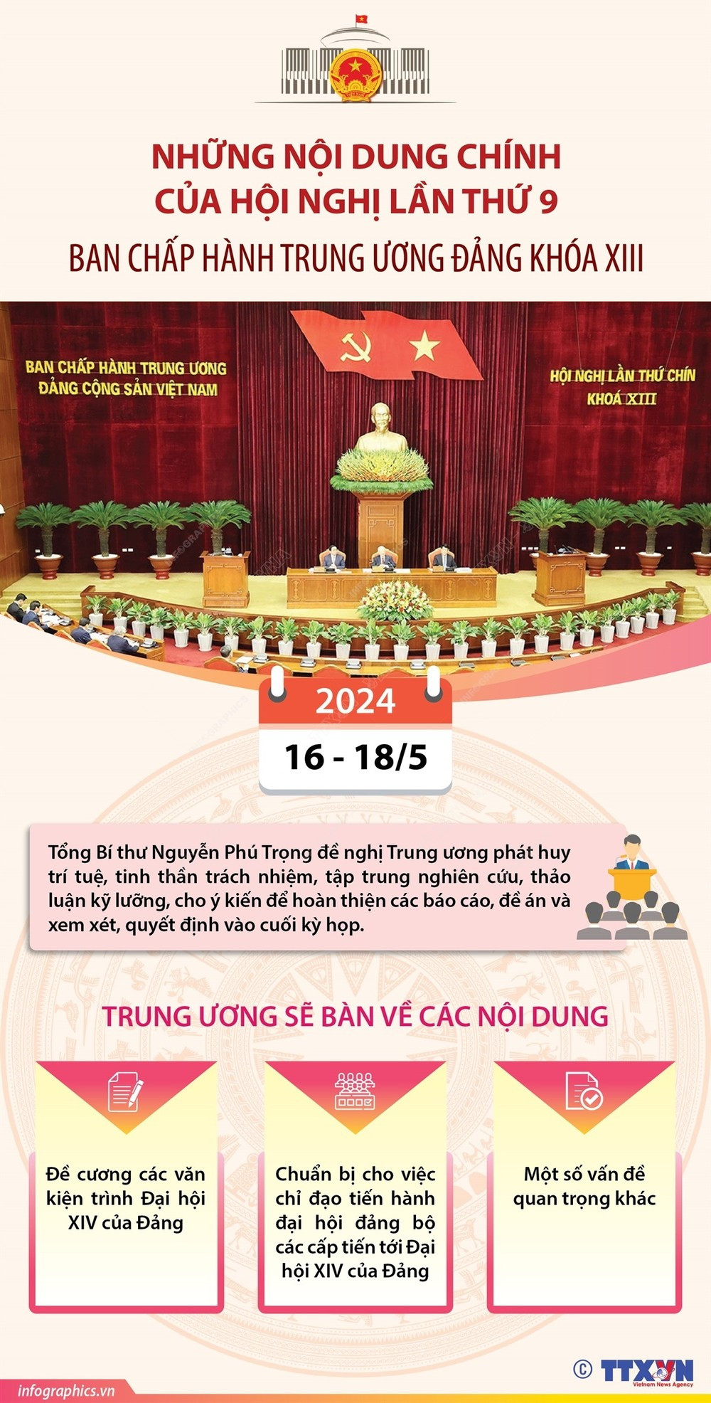 Sáng 16/5/2024, Hội nghị lần thứ chín Ban Chấp hành Trung ương Đảng khóa XIII đã khai mạc trọng thể tại Thủ đô Hà Nội.
