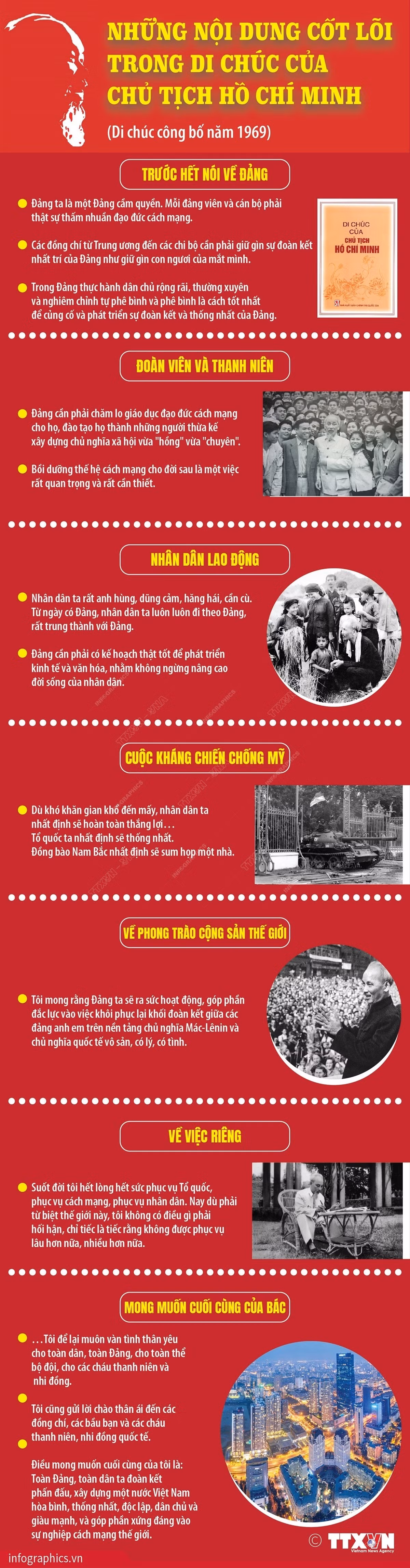 Từng câu, từng lời trong Di chúc là kết tinh của sự suy xét, trù tính thấu đáo, vừa cụ thể, vừa bao quát toàn bộ công việc, từ việc riêng cho đến những việc trọng đại của quốc gia, dân tộc.
