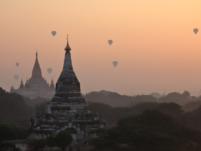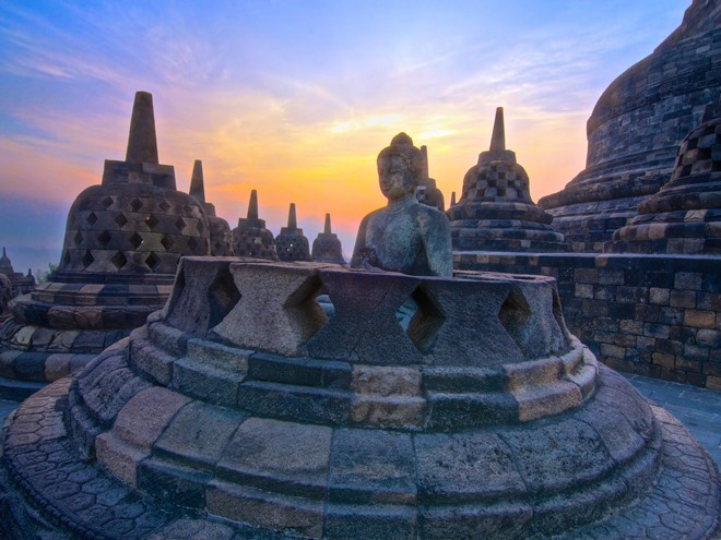 Đền Borobudur, Indonesia: Ánh nắng ban mai chiếu xuống ngôi đền Borobudur là một cảnh tượng kỳ ảo.